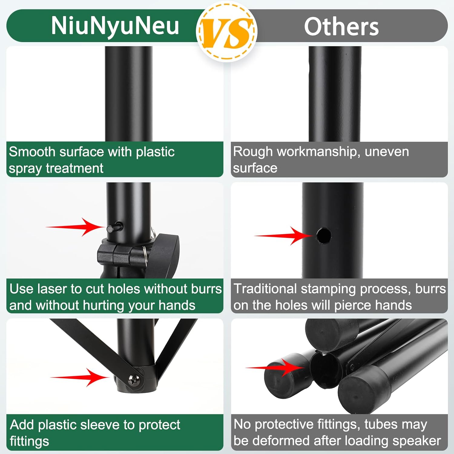Made of steel tube. The speaker stand is fitted with improved collar and mechanism to ensure security and stability. The main tube attaches to the tripod legs, which are reinforced with plastic sleeves to protect the tubing and enhance load-bearing capacity.