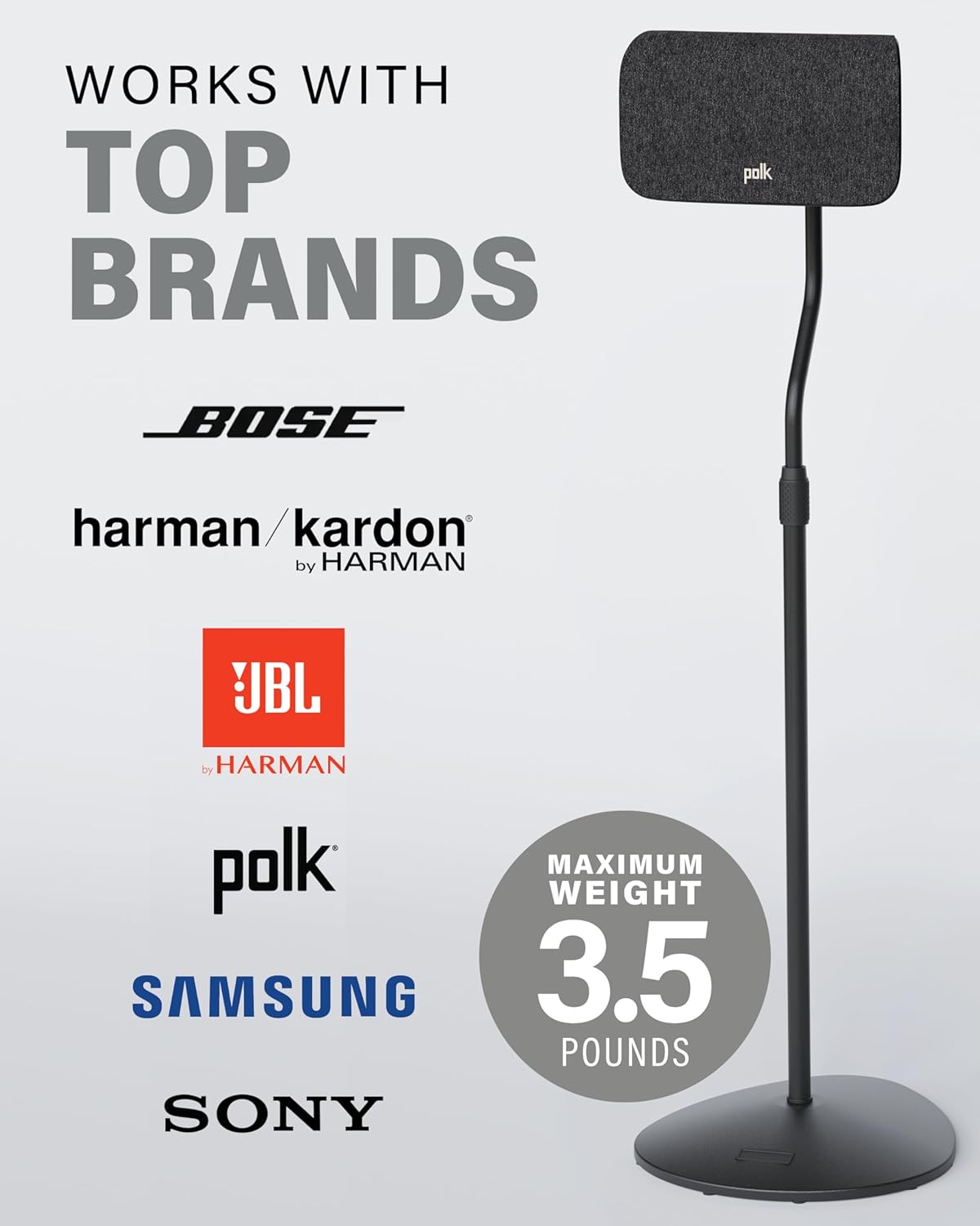 These SANUS speaker stands are compatible with a wide range of brands such as Bose, Vizio, Harmon Kardon, Polk, JBL,Samsung, Sony and more, working with small bookshelf or satellite speakers weighing up to 3.5 lbs.